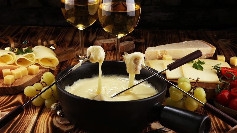 Fondue, a pot of creamy, melted cheese for dipping pieces of bread and meats. It was assigned as a national dish in Switzerland by the Swiss Cheese Union in the early ’30s to increase the consumption of cheese.